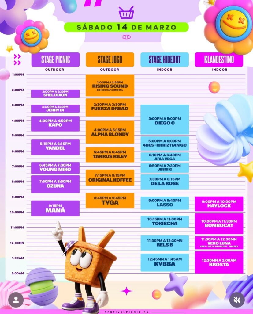 La organización confirmó la distribución de artistas en cuatro escenarios. El Stage Picnic reunirá a Shel Dixon, Jerry Di, Kapo, Yandel, Young Miko, Ozuna y Maná durante la tarde y la noche.