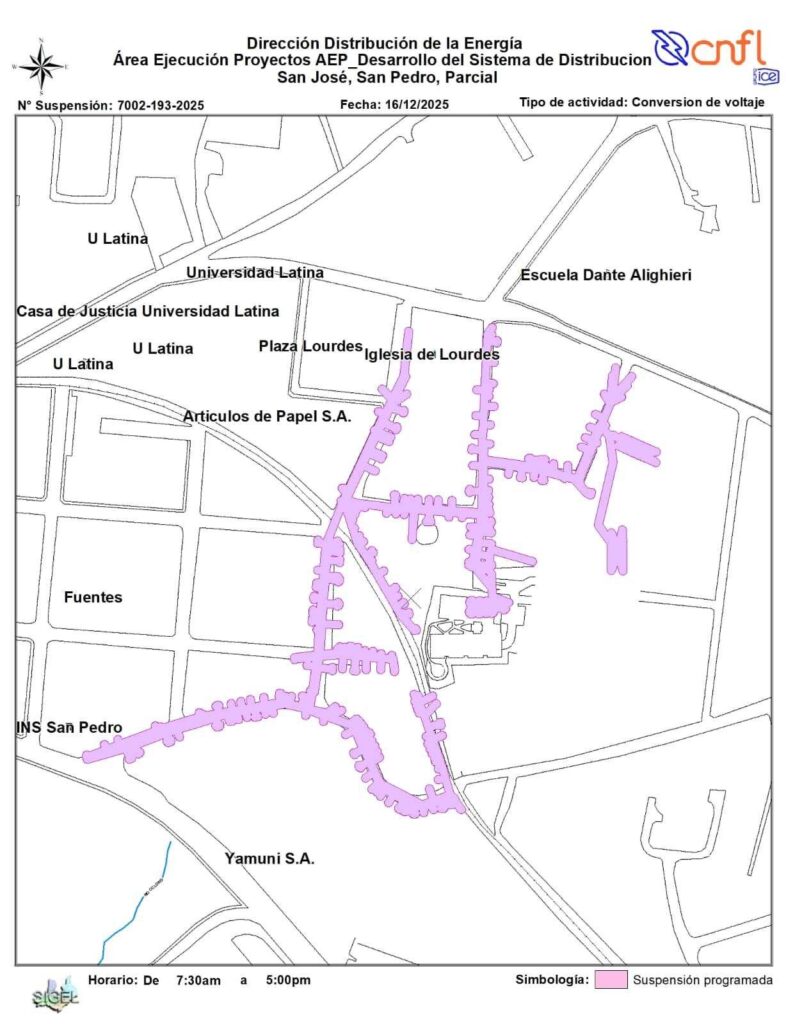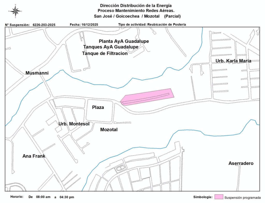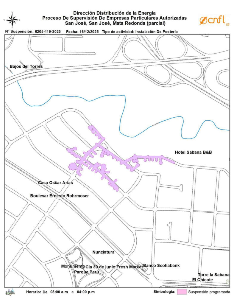 Otros puntos afectados en San José incluyen Mata Redonda, con suspensión parcial de 8:00 a.m a 4:00 p.m; Tibás, distrito de San Juan, de 8:00 a.m a 4:30 p.m.; y Goicoechea, en Mozotal, en el mismo horario.