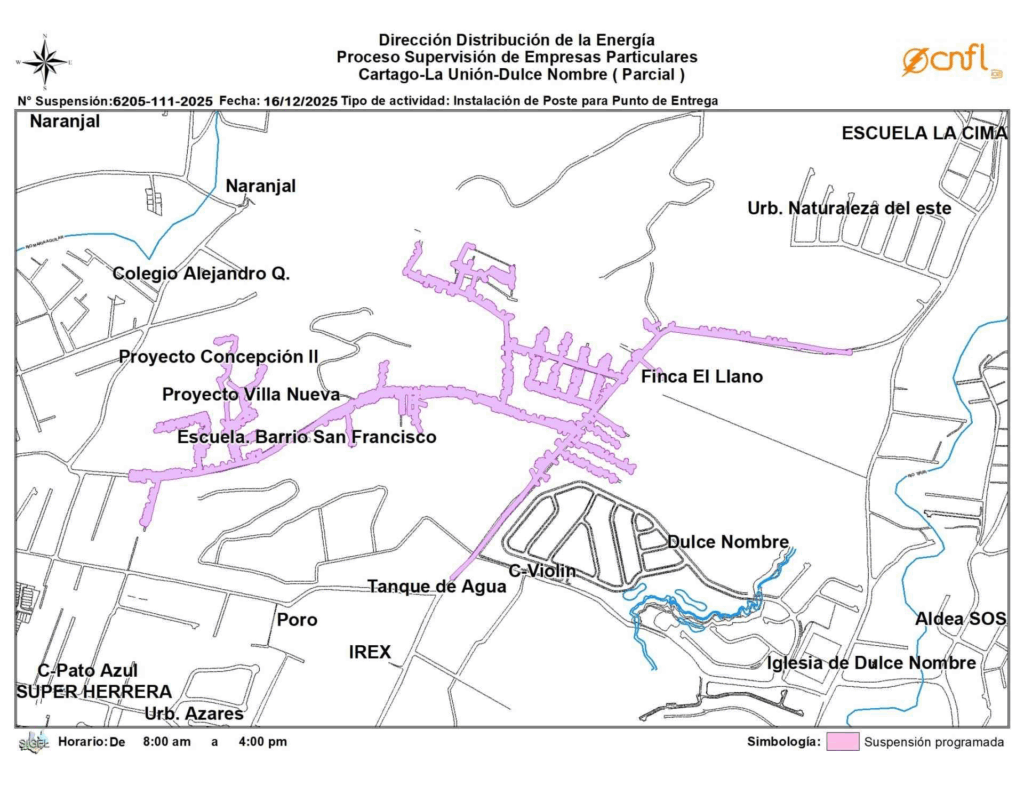 Cartago también enfrentará interrupciones; el sector de La Unión, específicamente Dulce Nombre, quedará sin electricidad de 8:00 a.m a 4:00 p.m.