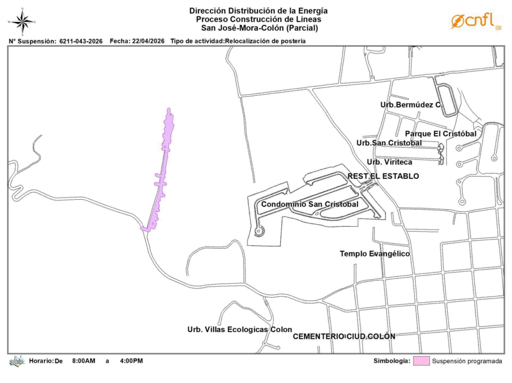 La Compañía Nacional de Fuerza y Luz (CNFL) anunció suspensiones eléctricas para este miércoles 22 de abril en dos sectores de San José, como parte de trabajos programados en la red.