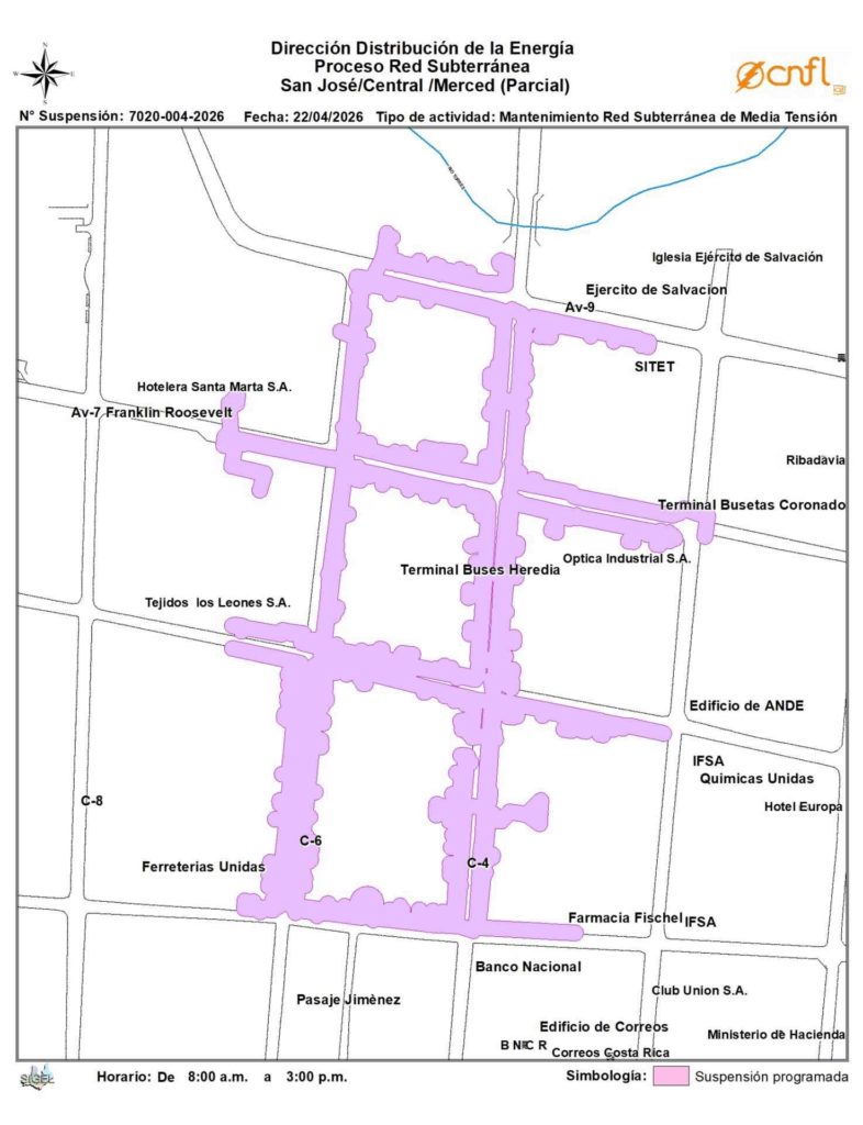 Otra suspensión afectará el distrito Merced, en el cantón Central de San José. En esta zona, la interrupción se extenderá de 8:00 a.m. a 3:00 p.m., también con impacto parcial.