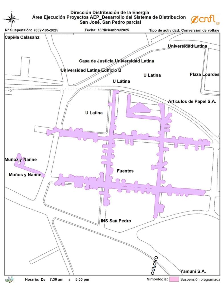 La Compañía de Fuerza y Luz (CNFL) informó que realizará cortes del servicio de luz en San Pedro, Moravia y Zapote en horarios entre las 7:30 a.m y las 5 p.m.