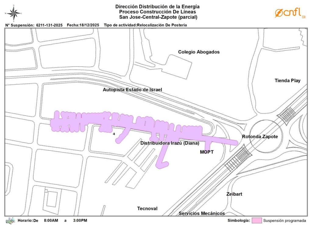 Finalmente, el corte en Zapote será desde las 8 a.m hasta las 3 p.m, debido a construcción de obras eléctricas y afectará 150 metros oeste de la Delegación del Tránsito.