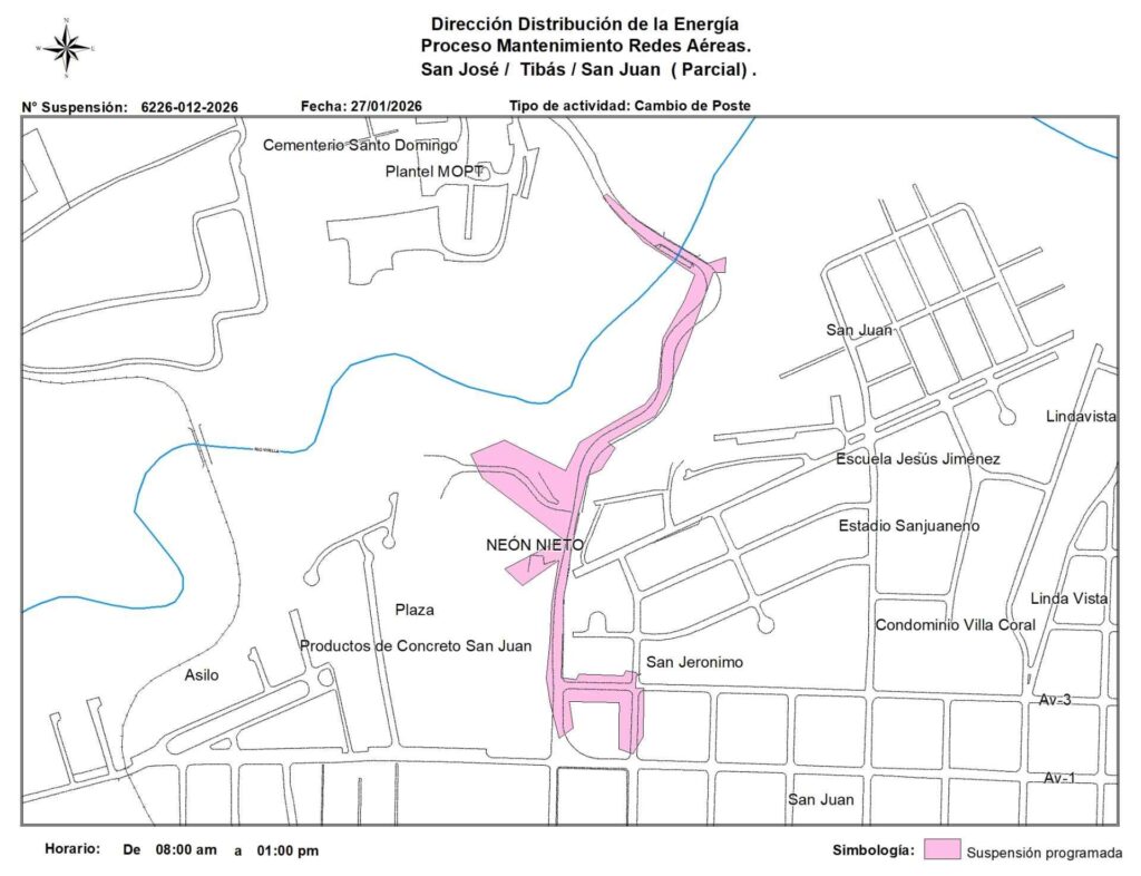 Por otra parte, el corte en San Juan Tibás será desde el puente sobre el Río Virilla al sur 300 metros hasta el Bar mi Taberna y al este a 100 metros hasta el súper La Luz; la suspensión será parcial de 8 a.m hasta la 1 p.m, por mantenimiento de obras eléctricas.