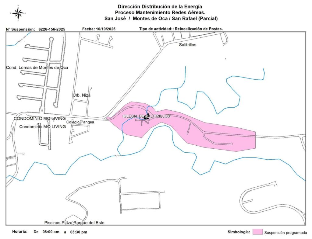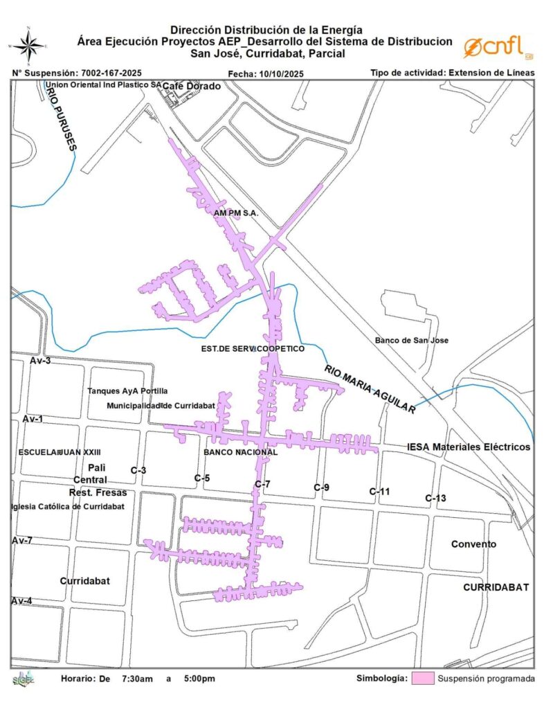 En el cantón de Curridabat, las interrupciones se aplicarán parcialmente entre las 7:30 a.m. y las 5:00 p.m., afectando algunos sectores del este de San José.