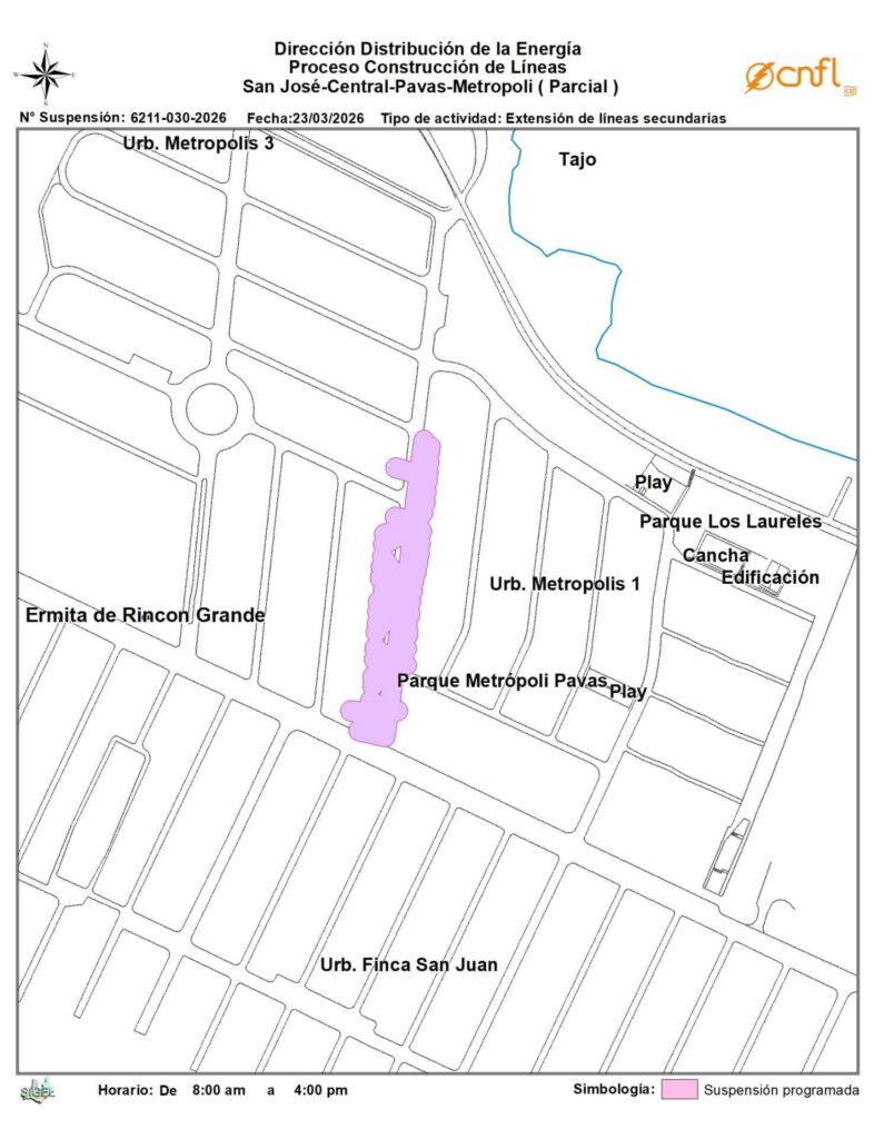 La Compañía Nacional de Fuerza Luz (CNFL) suspenderá el servicio eléctrico este lunes 23 de marzo en los sectores de San José centro, Pavas y Paseo Metrópolis.