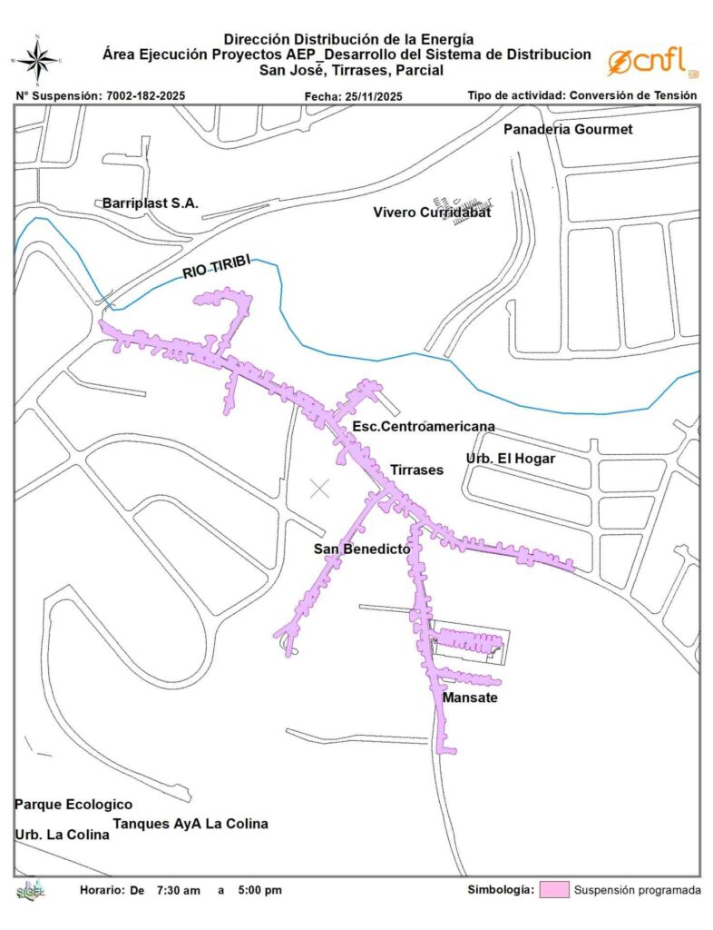 En Escazú, San Rafael la suspensión afectará 50 metros oeste del restaurante y cafetería COFFEE KIDS al oeste, hasta 1 kilómetro, desde las 8 a.m hasta las 4 p.m; el corte eléctrico se debe a mantenimiento de obras eléctricas en la zona.