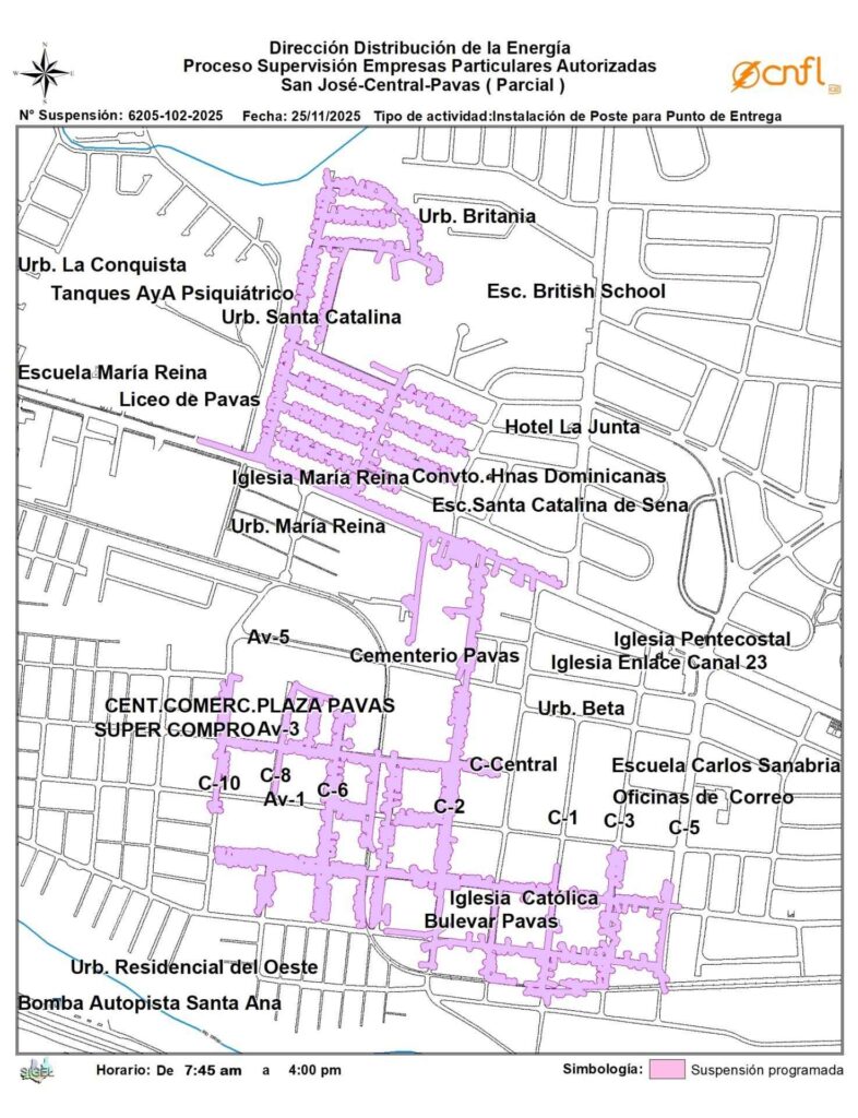 En el caso de San José central y Pavas, el corte será de 7:30 a.m a 4pm, por obras de contrato de redes eléctricas.