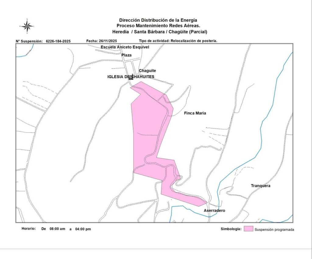 En Heredia, Santa Bárbara y Chaguite, los cortes se deben al mantenimiento de obras eléctricas, a partir de las 8:00 am hasta las 4:00 pm, este sector abarca desde la bodega Acosta en el cruce hasta la iglesia católica de Chaguite.