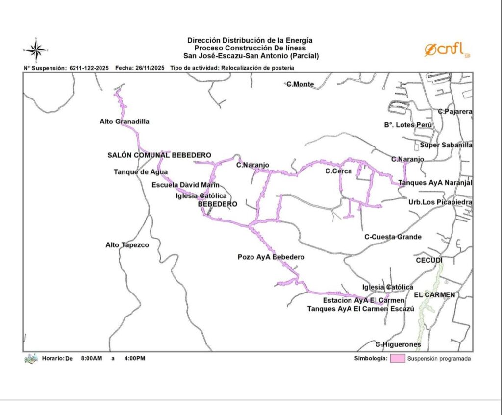 Los cortes en San Antonio de Escazú, se deben a la construcción de obras eléctricas e iniciarán a las 8:00 am y se prolongarán hasta las 4:00 pm, en el sector de la Ermita Nuestra Señora del Carmen 750 metros suroeste.
