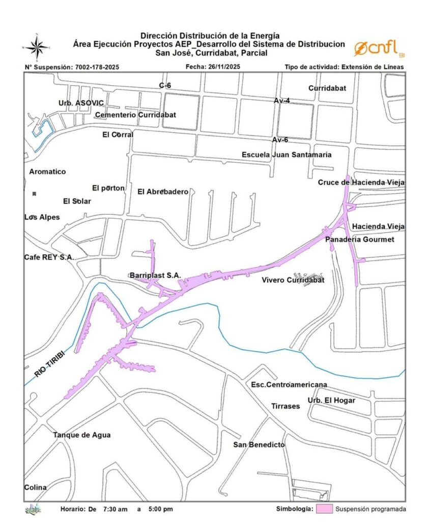 En la zona de Curridabat, los cortes se deben a proyectos empresariales, a partir de las 7:30 am hasta las 5:00 pm, este sector abarca desde la rotonda de Hacienda vieja hasta la avenida 56B.