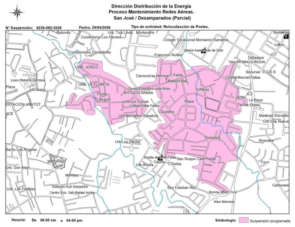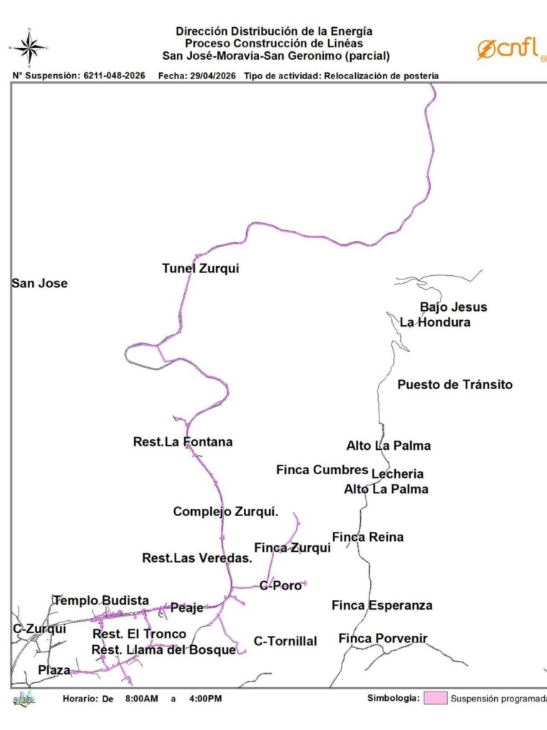 En San Jerónimo de Moravia, el corte afectará de 8:00 a. m. a 4:00 p. m. debido a la construcción de infraestructura eléctrica.