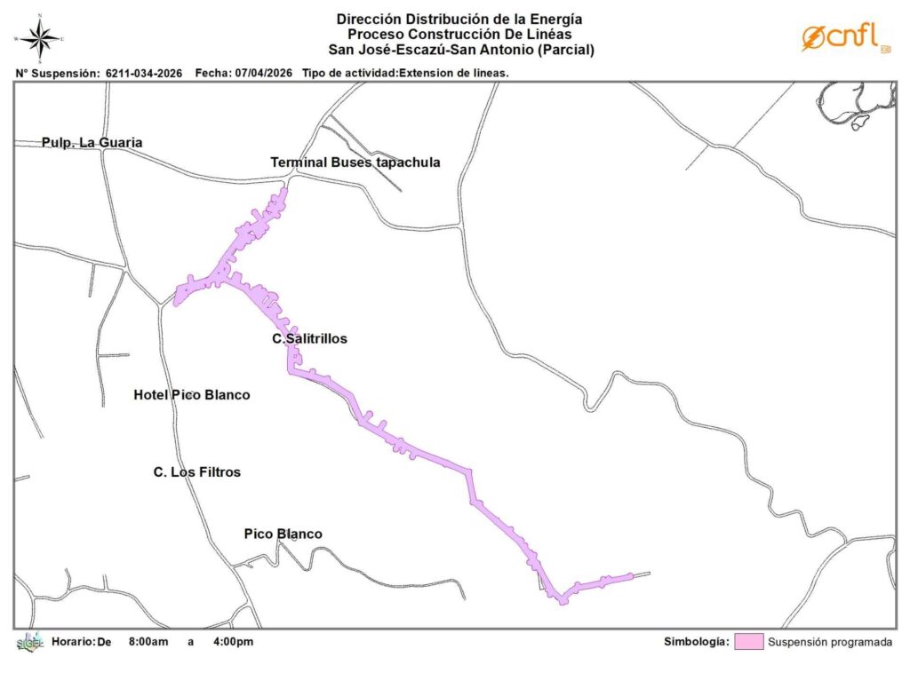La Compañía Nacional de Fuerza Luz (CNFL) suspenderá el servicio eléctrico este miércoles 8 de abril en los sectores de Escazú, San Sebastián y Sagrada Familia.