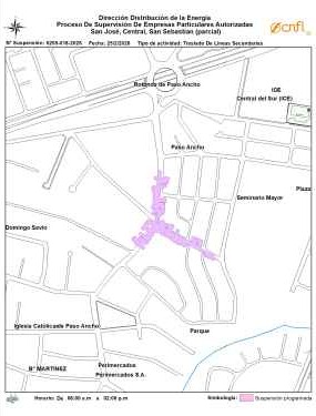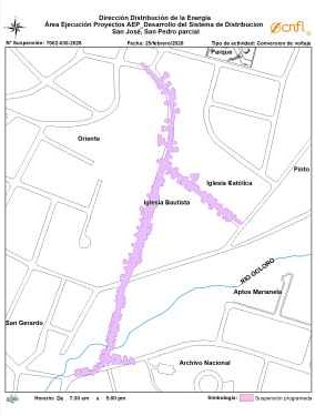 Continuando en San José, en el cantón central en San Sebastián, los cortes iniciarán a las 8:00 am y terminarán a las 2:00 pm, el motivo de la interrupción del servicio es debido a obras por contrato de redes eléctricas.