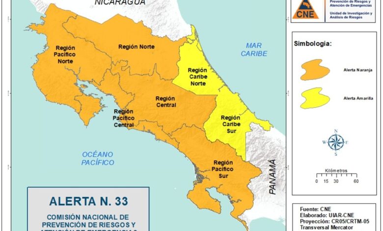 La Comisión Nacional de Emergencias (CNE) declaró este domingo la alerta naranja en la mayor parte del país, mientras que la región Caribe continúa bajo alerta amarilla por las intensas lluvias de las últimas horas.