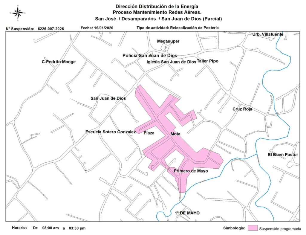 La Compañía Nacional de Fuerza y Luz (CNFL) informó sobre un corte de electricidad programado para este viernes 16 de enero en el cantón de Desamparados, provincia de San José.