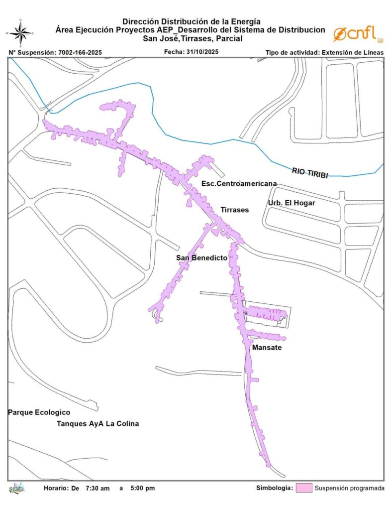 La Compañía Nacional de Fuerza Luz (CNFL) anunció cortes del servicio en los sectores de Tirrases y San José Centro, debido a proyectos empresariales y obras por contrato de redes eléctricas.