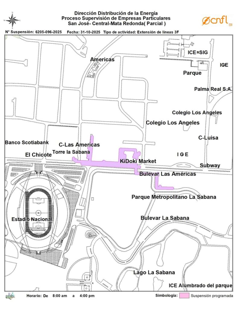 Para los vecinos de San José Central, Mata Redonda, el corte será del condominio Torres del Parques 75 metros al oeste, a partir de las 8 a.m hasta las 4 p.m.