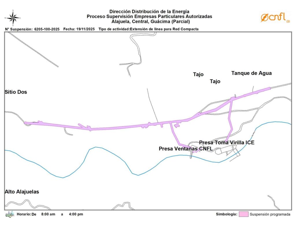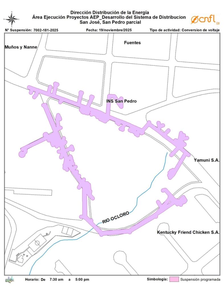 La empresa informó que San Pedro Montes de Oca registrará una suspensión entre las 7:30 a.m. y las 5:00 p.m. debido a proyectos empresariales.