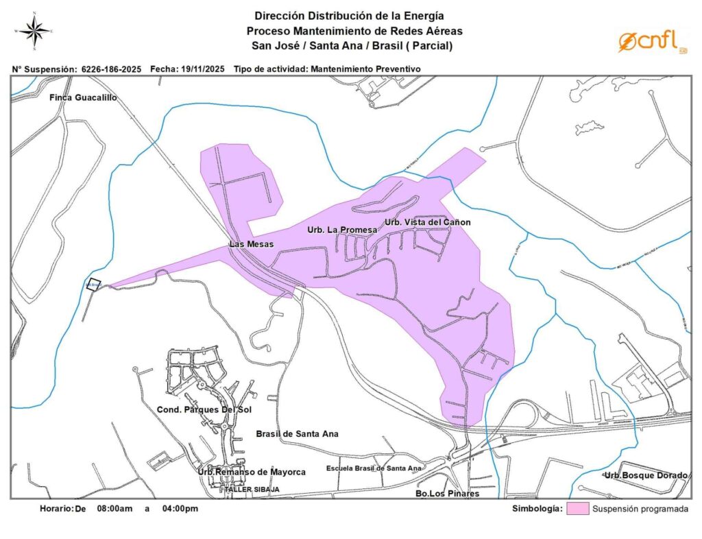 La Compañía Nacional de Fuerza y Luz (CNFL) anunció varios cortes eléctricos programados para este miércoles 19 de noviembre, con el fin de ejecutar trabajos de mejora y mantenimiento en distintos sectores del país.