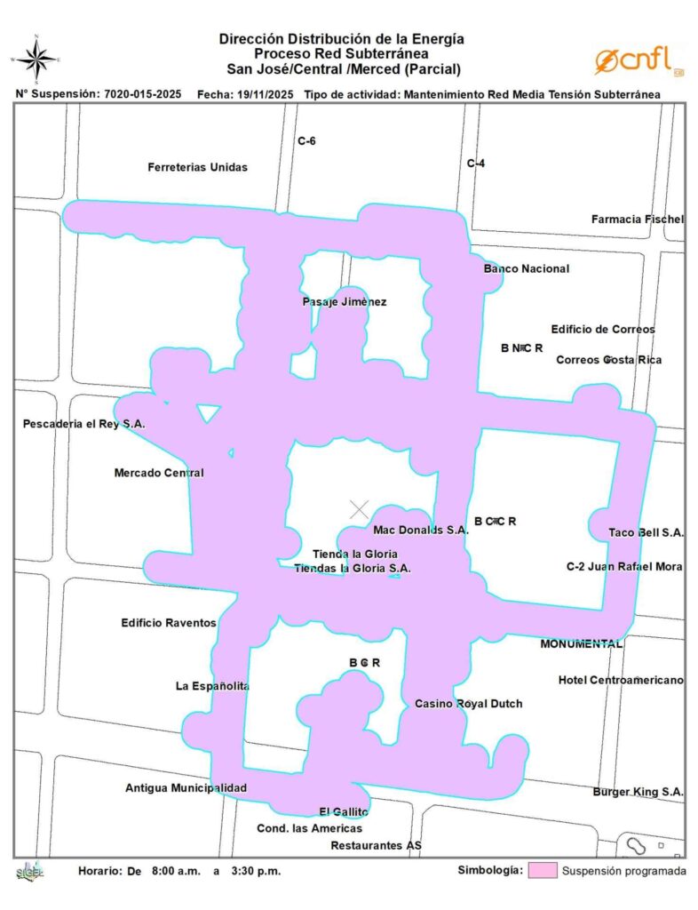 En San José, distrito Merced, el servicio se interrumpirá parcialmente entre las 7:30 a.m. y las 3:00 p.m., por trabajos de distribución eléctrica subterránea.