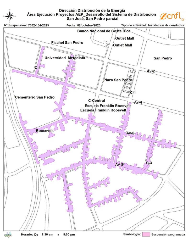 En el caso de San Pedro, las zonas afectadas son de la Universidad Americana 200 metros hacia el Oeste sobre Avenida 10 hasta el costado Norte del Cementerio de San Pedro incluyendo parcialmente las calles 53 y 55, a partir de las 7:30 a.m hasta las 5 p.m.