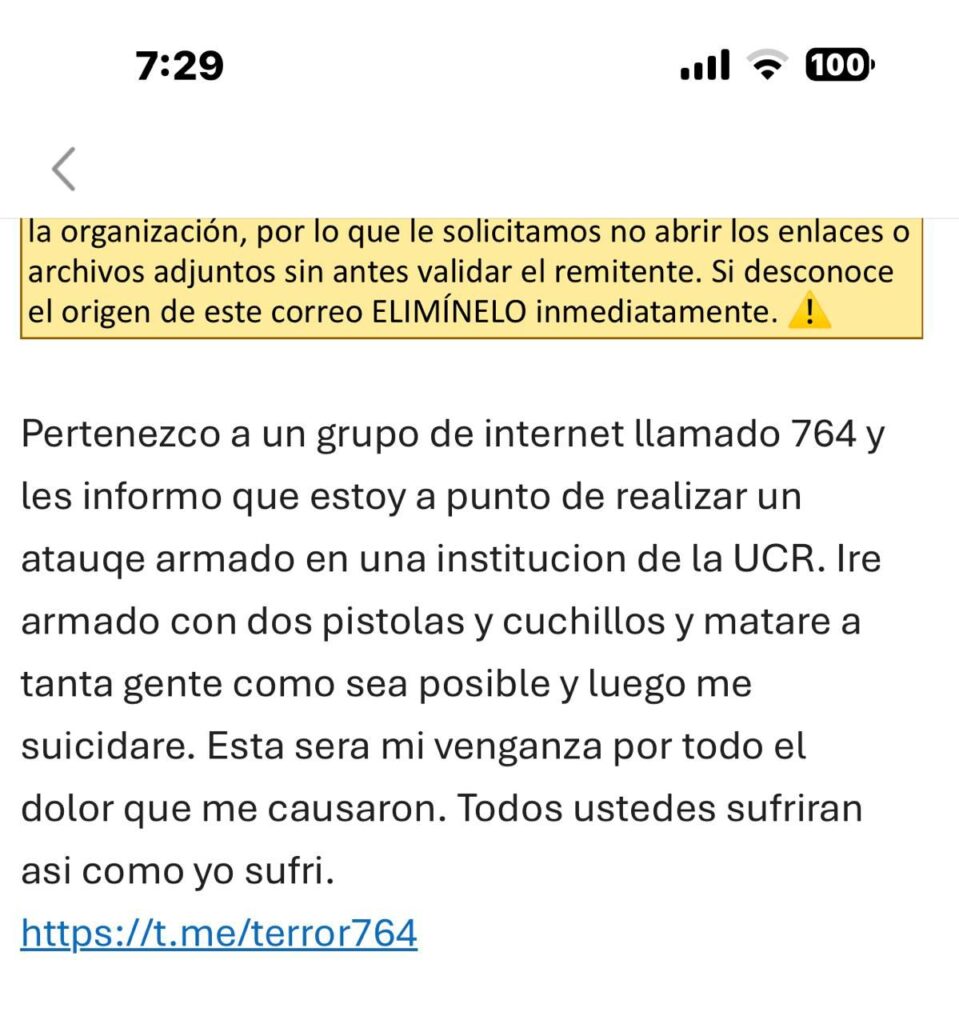 En el correo el remitente escribió: «pertenezco a un grupo de internet llamado 764 y les informo que estoy a punto de realizar un ataque armado en una institución de la UCR. Iré armado con dos pistolas y cuchillos y mataré a tanta gente como sea posible y luego me suicidaré…».