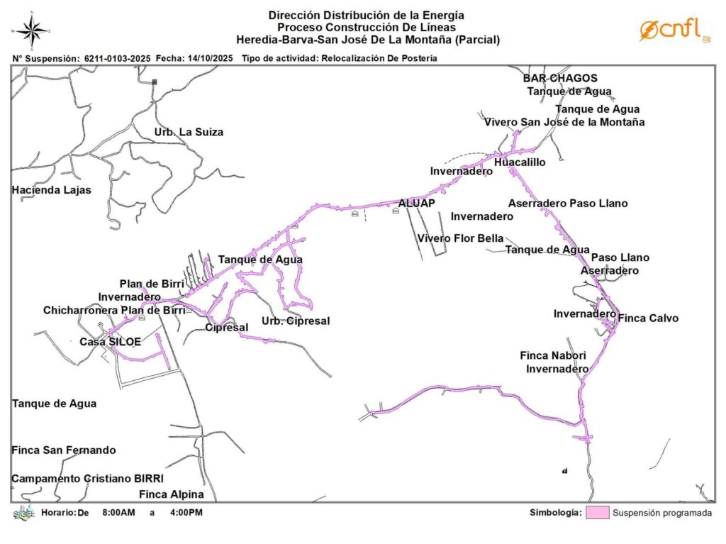 La CNFL interrumpirá el suministro de electricidad en el cantón de Barva, específicamente en San José de la Montaña, de forma parcial.