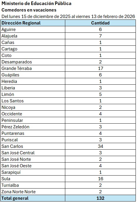El Ministerio de Educación Pública (MEP) dio a conocer que al menos 132 comedores escolares permanecerán abiertos durante las vacaciones de fin y principio de año.