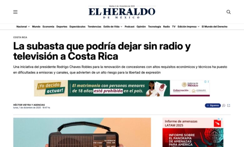 El medio de comunicación “El Heraldo” de México, publicó este lunes una noticia titulada “La subasta que podría dejar sin radio y televisión a Costa Rica”, en la que advierte sobre la iniciativa que impulsa el Poder Ejecutivo por medio de la Superintendencia de Telecomunicaciones (Sutel).
