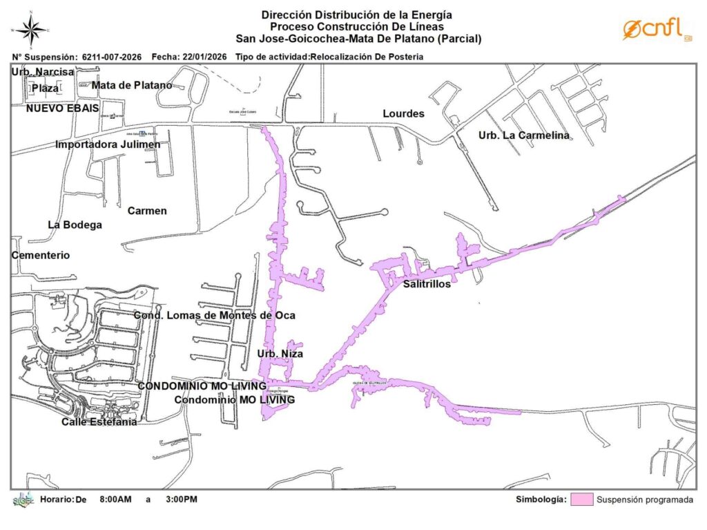 En Goicoechea, específicamente en el sector de Mata Plátano, la CNFL interrumpirá el suministro eléctrico entre las 8:00 de la mañana y las 3:00 de la tarde, como parte de los trabajos previstos para ese día.