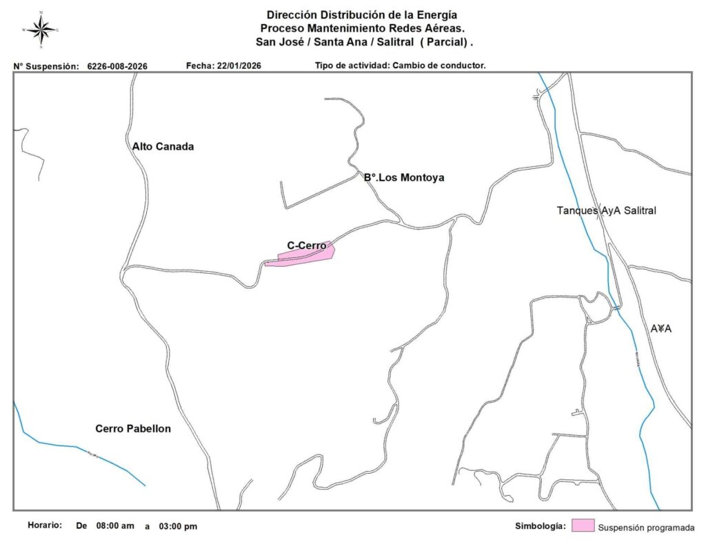 La suspensión también afectará al cantón de Santa Ana, en el distrito de Salitral, donde la empresa aplicará el corte del servicio en el mismo horario, de 8:00 de la mañana a 3:00 de la tarde.