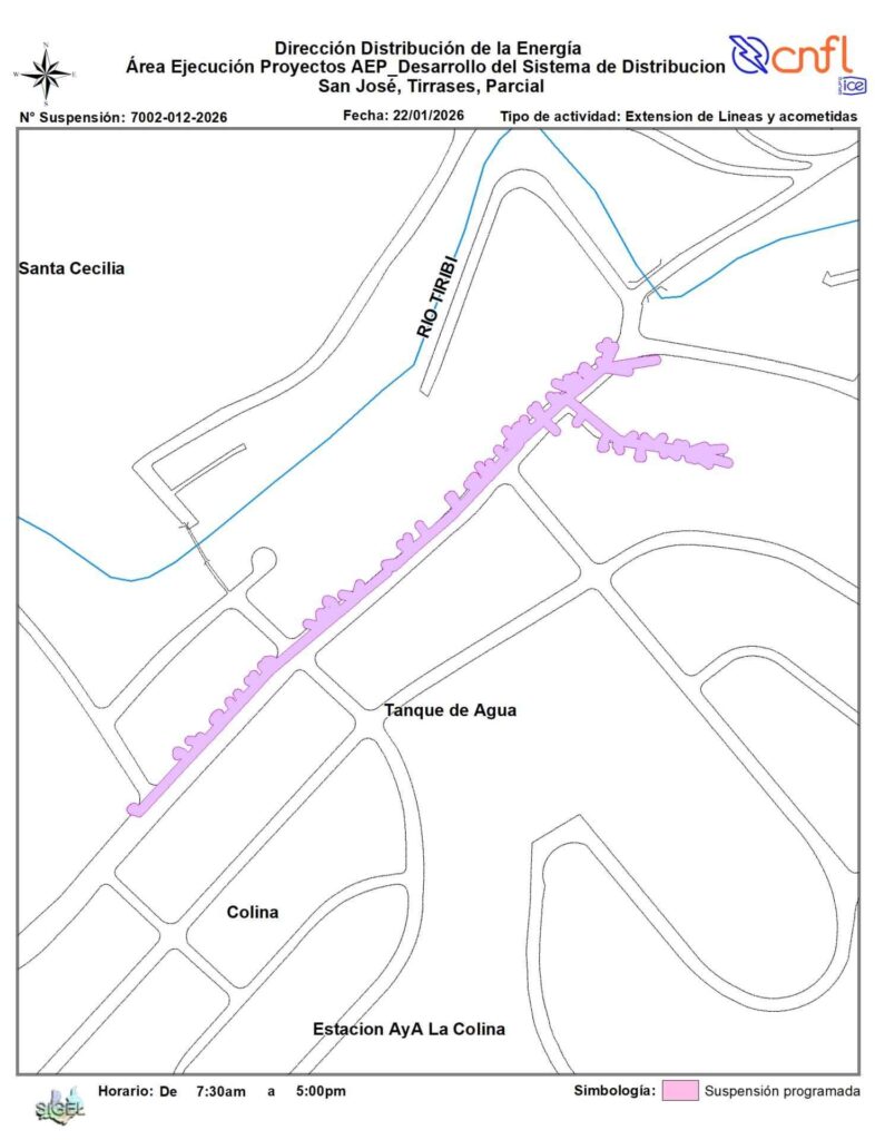 En el cantón de San José, el distrito de Tirrases enfrentará la interrupción del servicio desde las 7:30 de la mañana y hasta las 5:00 de la tarde.