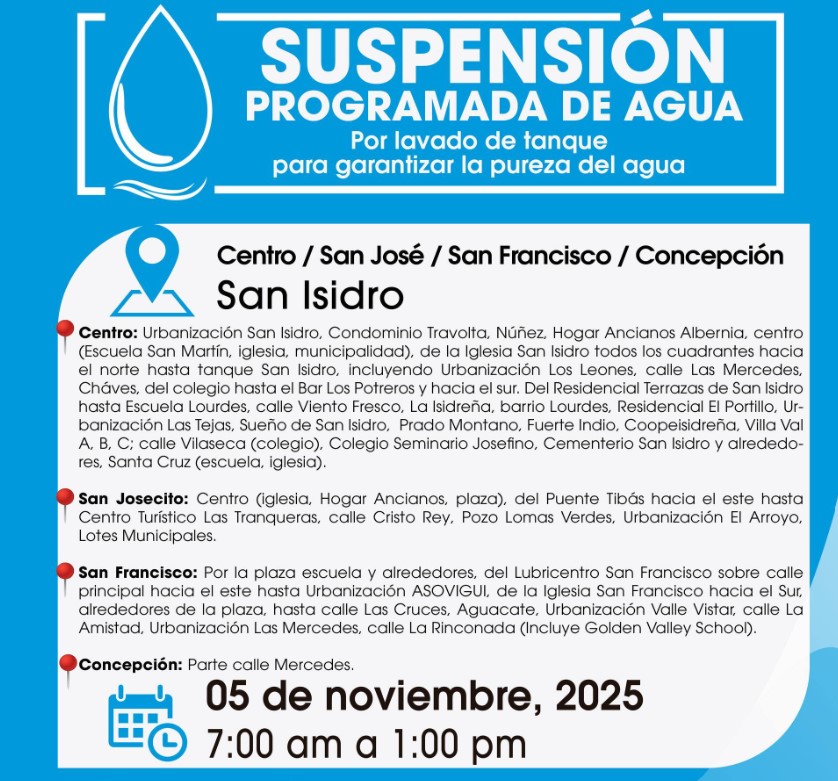 Por otro lado, en el cantón de San Isidro, la suspensión será en la zona central, San Josecito y Concepción; de 7 a.m. a 1 p.m.