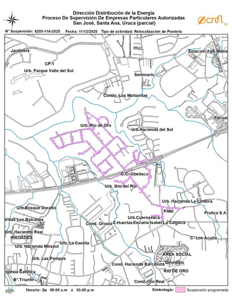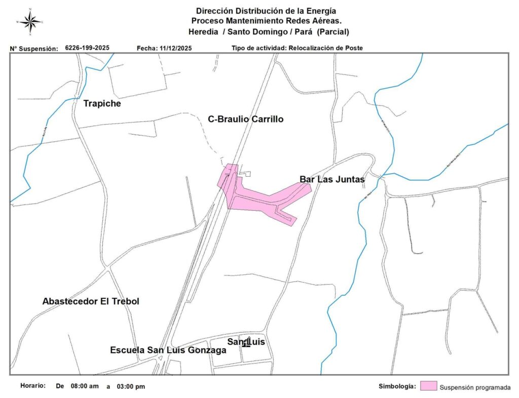 En Heredia, el distrito de Santo Domingo, en el sector de Pará, también enfrentará interrupciones eléctricas entre las 7:30 a.m. y las 3:30 p.m.