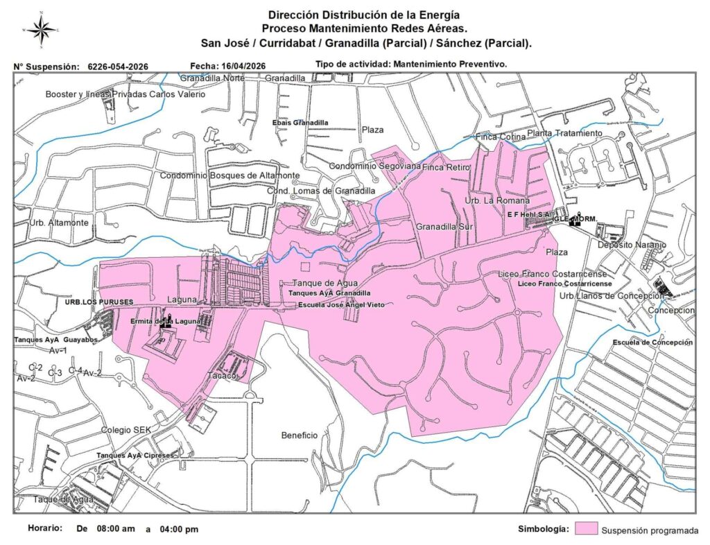 El servicio se interrumpirá en el sector de Curridabat, específicamente en Granadilla, de 8:00 de la mañana a 4:00 de la tarde.