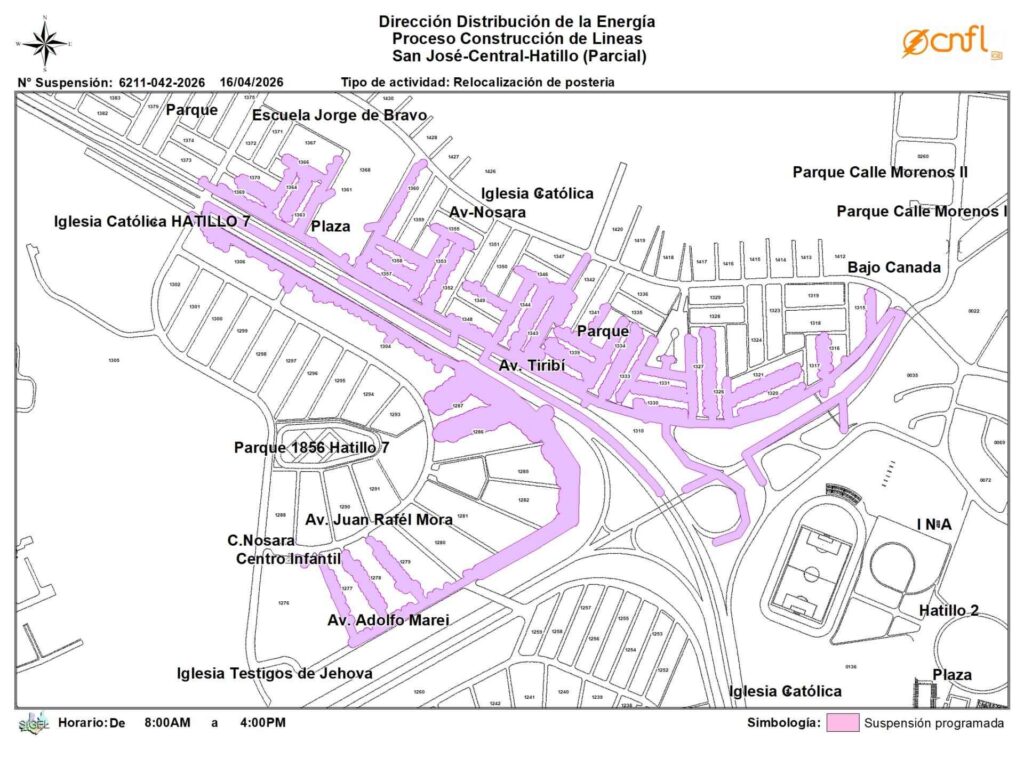 Hatillo, en el cantón central de San José, enfrentará suspensión del servicio eléctrico entre las 8:00 de la mañana y las 4:00 de la tarde.
