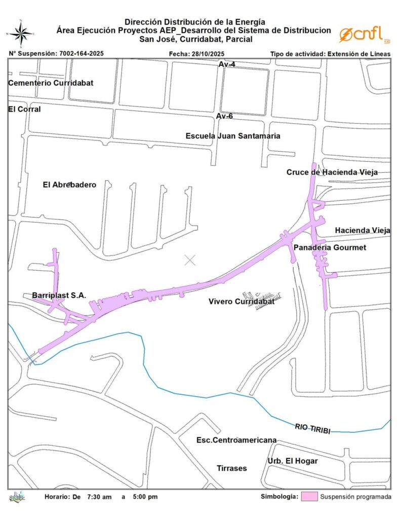 En el cantón de Curridabat, la interrupción del suministro se realizará de 7:30 a.m. a 5:00 p.m., como parte de proyectos empresariales desarrollados por la institución.