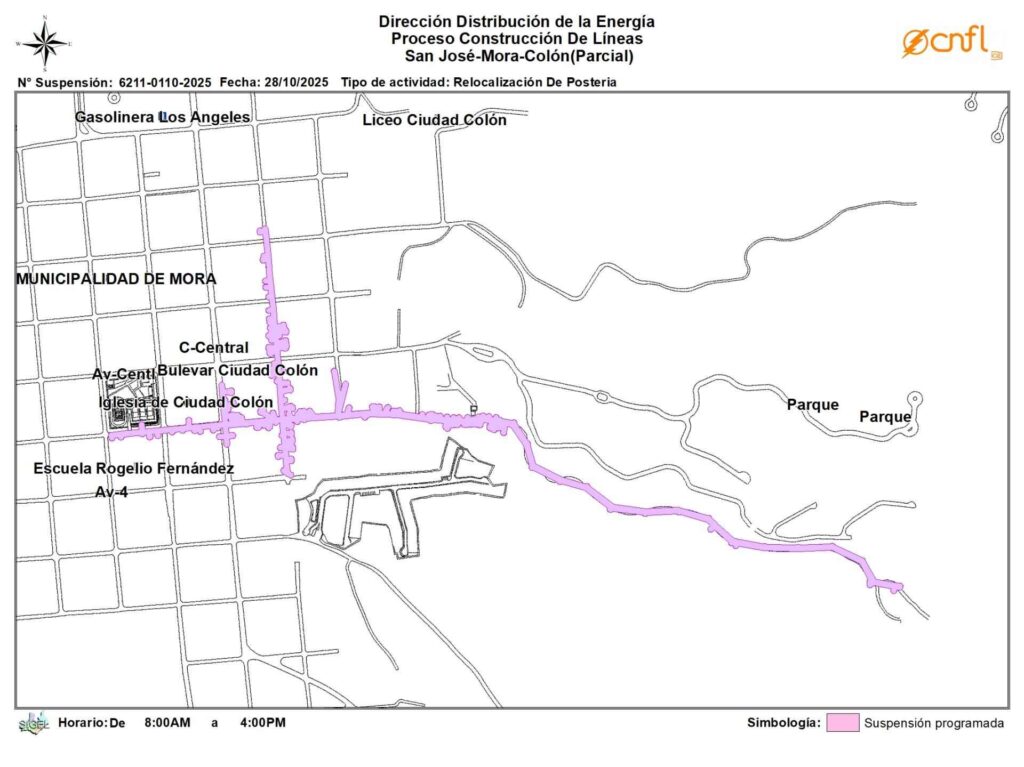 Además, en Mora, específicamente en el distrito de Colón, la CNFL llevará a cabo trabajos de construcción de obras eléctricas entre las 8:00 a.m. y las 4:00 p.m.